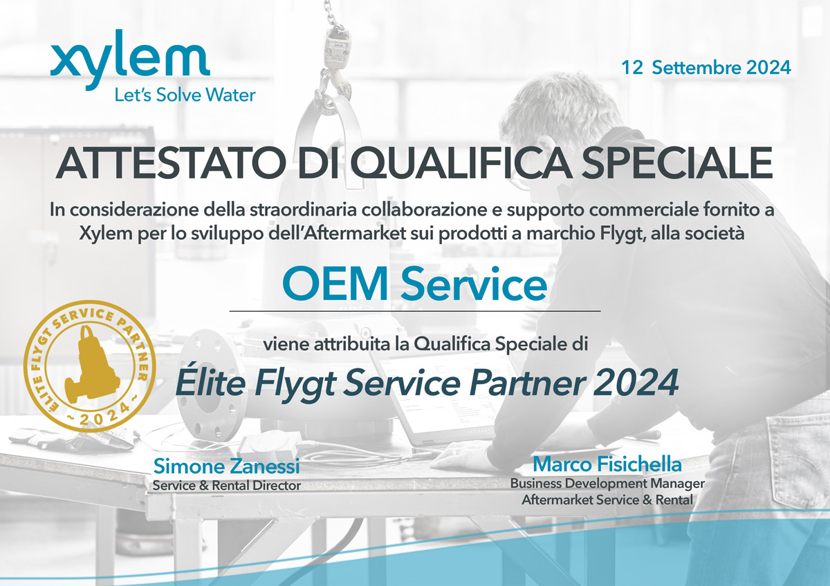 Un’esperienza che nasce nel 1981 e la forza di una consolidata partnership con Flygt, leader mondiale nelle elettropompe sommergibili, sono le basi della professionalità che ogni giorno sappiamo garantire ai nostri clienti, nella progettazione, realizzazione e manutenzione dei loro impianti di sollevamento acque reflue e di altre apparecchiature elettromeccaniche. Una professionalità premiata dalla loro soddisfazione e certificata in ogni suo agire. Sicuramente. La società OEM SERVICE ha adottato un Sistema di Gestione Integrato Qualità, Sicurezza e Ambiente certificato in conformità alle norme ISO 9001:2015, ISO 14001:2015, ISO 45001:2018.